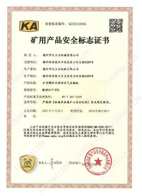 矿安空压机,矿用空压机报价,矿山空压机作用,空压机,特种空压机,空压机矿安使用证,矿安认证的空压机,空压机矿安证矿安机,矿安压缩机适合各种金属矿,铁矿,金矿,石膏矿,荧石矿,绨矿,铜矿,钻石矿等等。有少量易燃气体产出,所以压缩机需要有限制性防爆。有矿安标志证书。我公司已经取得相关证书:1.压缩机生产许可证(老)。2,BT4防爆压缩机防爆证 3,CT压缩机防爆许可证 4,防尘爆压缩机许可证 5,煤安标志防爆压缩机许可证。 6,矿安标志证书我公司可定制各种规格空压机,电话13365348115(微信同号)